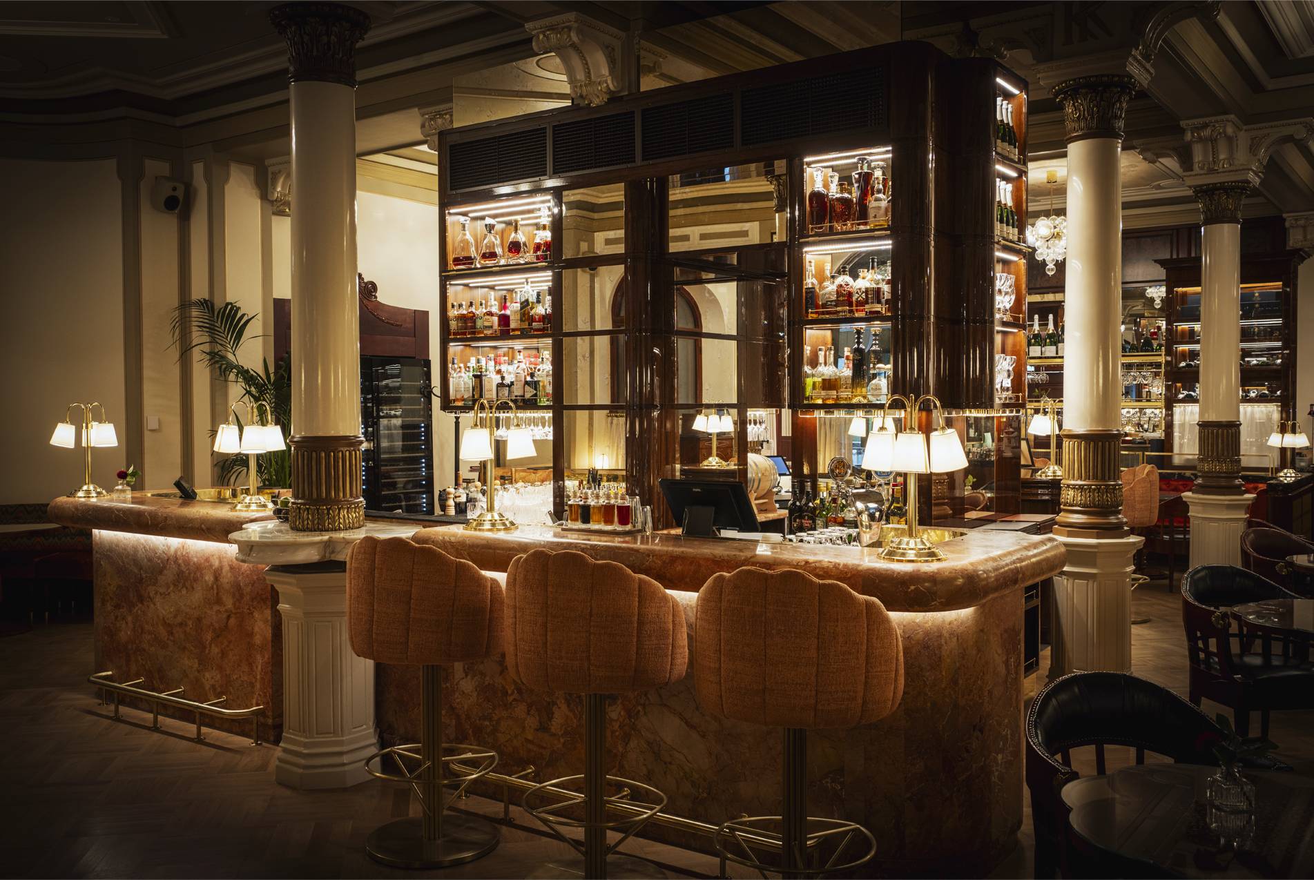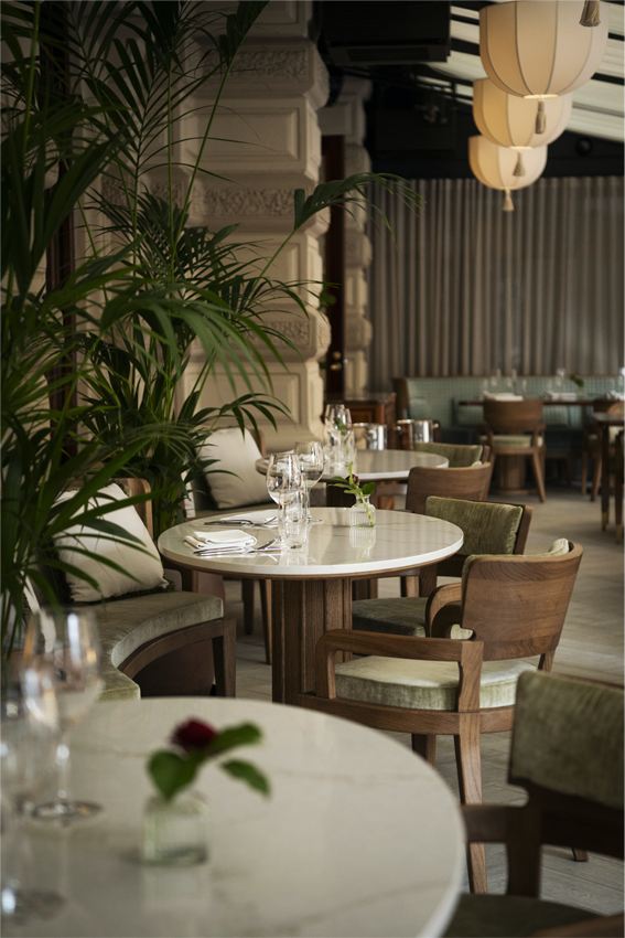 The design, led by Archer Humphryes Architects, reflects the studio’s long-standing provenance in placemaking within historic buildings, where heritage becomes the foundation for new experience. Here, the vision brings together what press coverage describes as “the elegance of Neoclassicism, the organic sensuality of Art Nouveau and the optimism of the Belle Époque,” weaving restored architectural character with refined contemporary detail. Polished mahogany, marble, satin brass and soft velvets create a layered material palette that feels both grand and intimate. A standout feature is the Winter Garden terrace, a glassed-in space overlooking Esplanade Park that is fully openable in summer, allowing the brasserie to spill out into the city’s most iconic promenade and creating a seamless connection between interior elegance and Helsinki’s outdoor life.